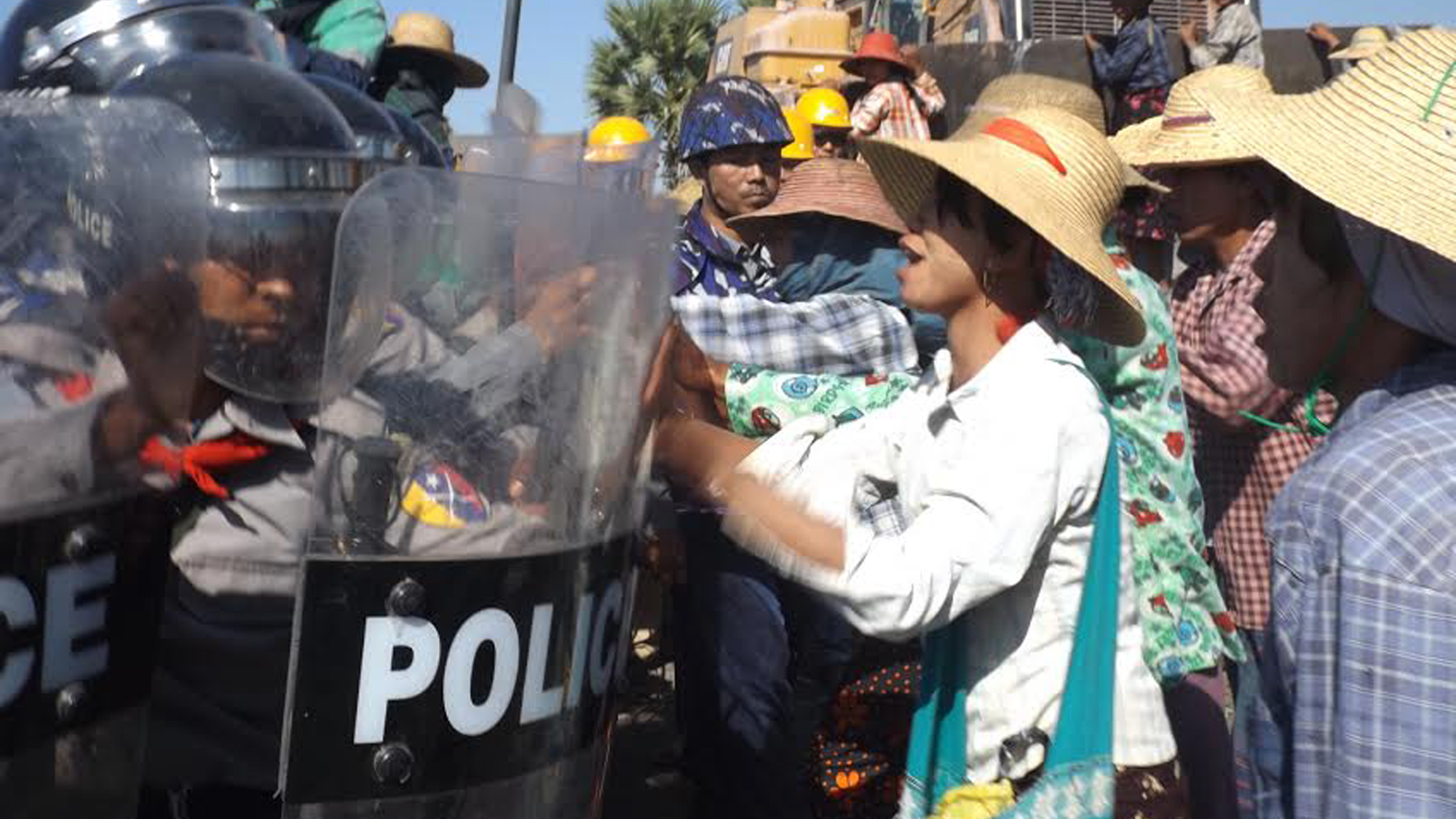 Farmers confront riot police at the site of the Letpadaung copper mine in northwestern Myanmar on Monday. A woman was fatally shot during a crackdown on protesters at the Chinese-backed copper mine. (AP)
