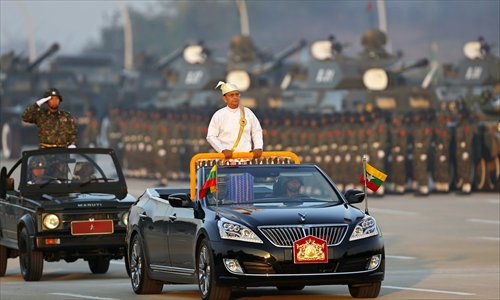 President Thein Sein of Myanmar reviews soldiers during a ceremony to mark the 67th anniversary of Myanmar's Independence Day, in Nay Pyi Taw, Myanmar's capital, on Sunday. This is the first time since the military coup in 1962 that a military parade was held to mark the day. Myanmar gained independence from Britain on January 4, 1948. Photo: IC